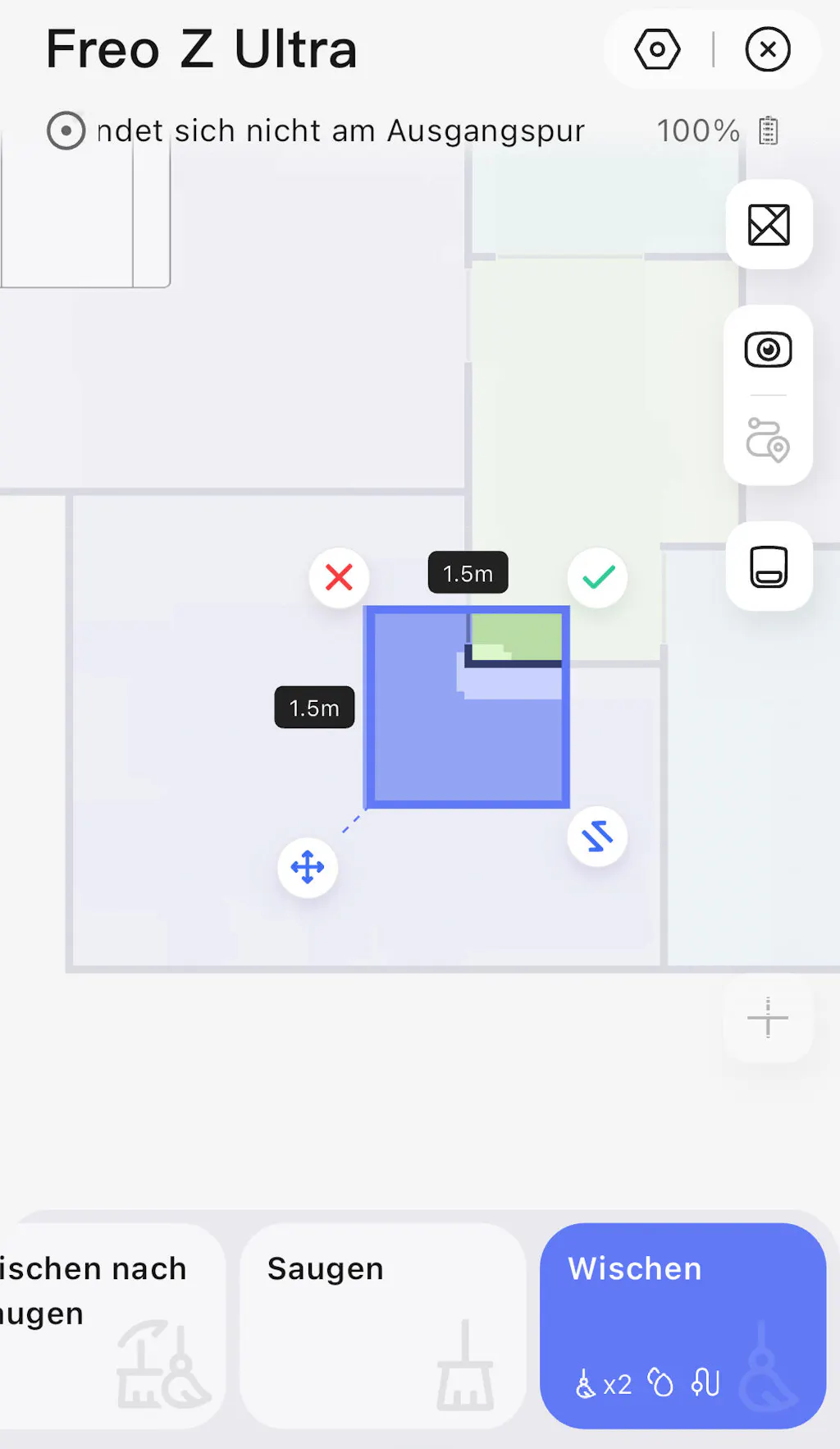 Ein kleiner Kritikpunkt ist jedoch die App, die für uns oft nicht ganz übersichtlich ist. Im Hauptkarten-Modus (bei uns das Erdgeschoss) können wir alle Zimmer individuell auswählen und reinigen lassen – das funktioniert super. Allerdings gibt es im zweiten Karten-Modus (2. Stock) Einschränkungen. Dort kann man lediglich einzelne Bereiche manuell „hinzufügen“, aber keine individuellen Räume (wie z. B. Badezimmer und Toilette) kombinieren.